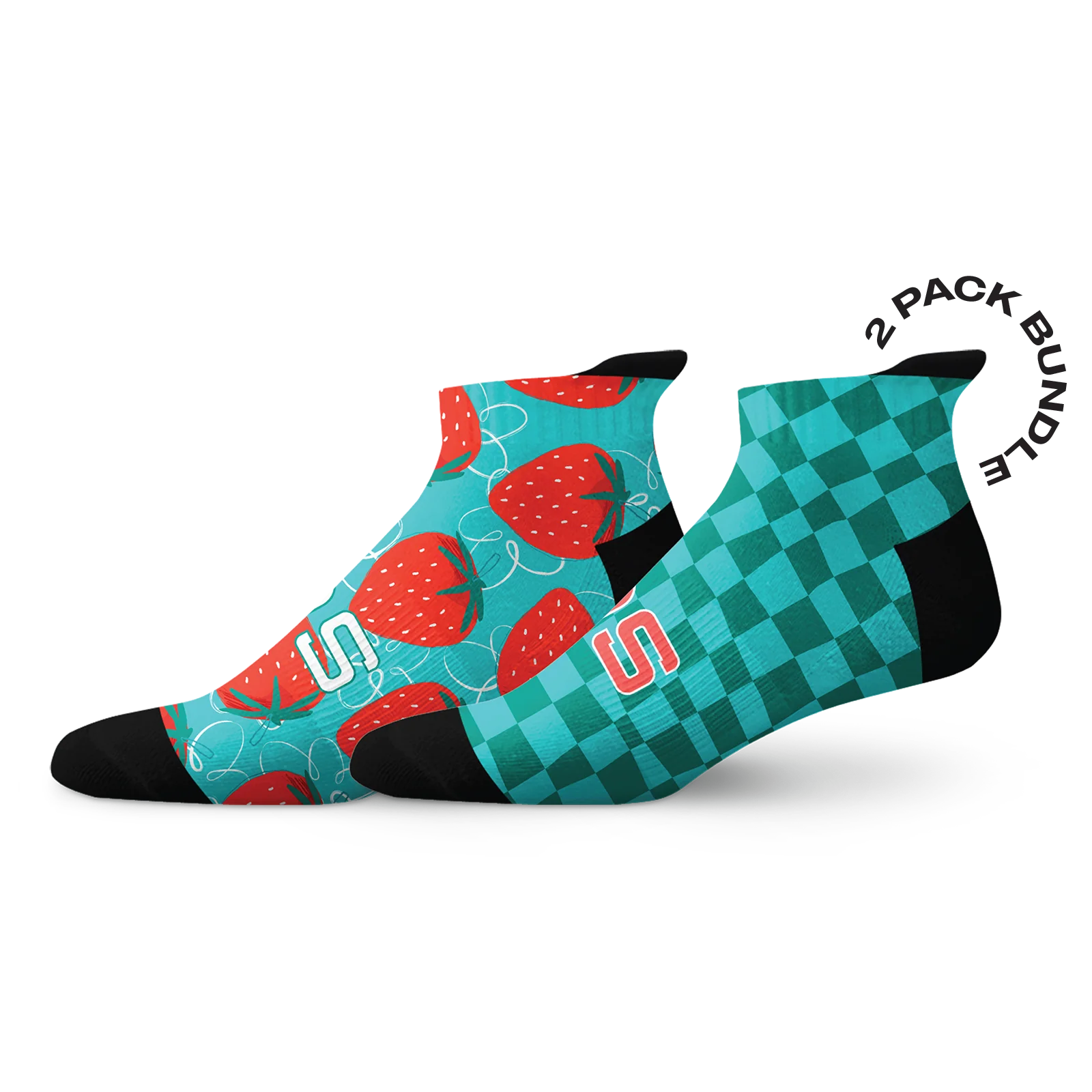 The Berries Tab Socks Combo blends sweet style with a vibrant design. One pair is filled with juicy red strawberries, while the other features a bold teal checkerboard pattern. It is a playful and energetic combo that's perfect for summer. The Sox Footwear Tab Socks are made for everyday movers.