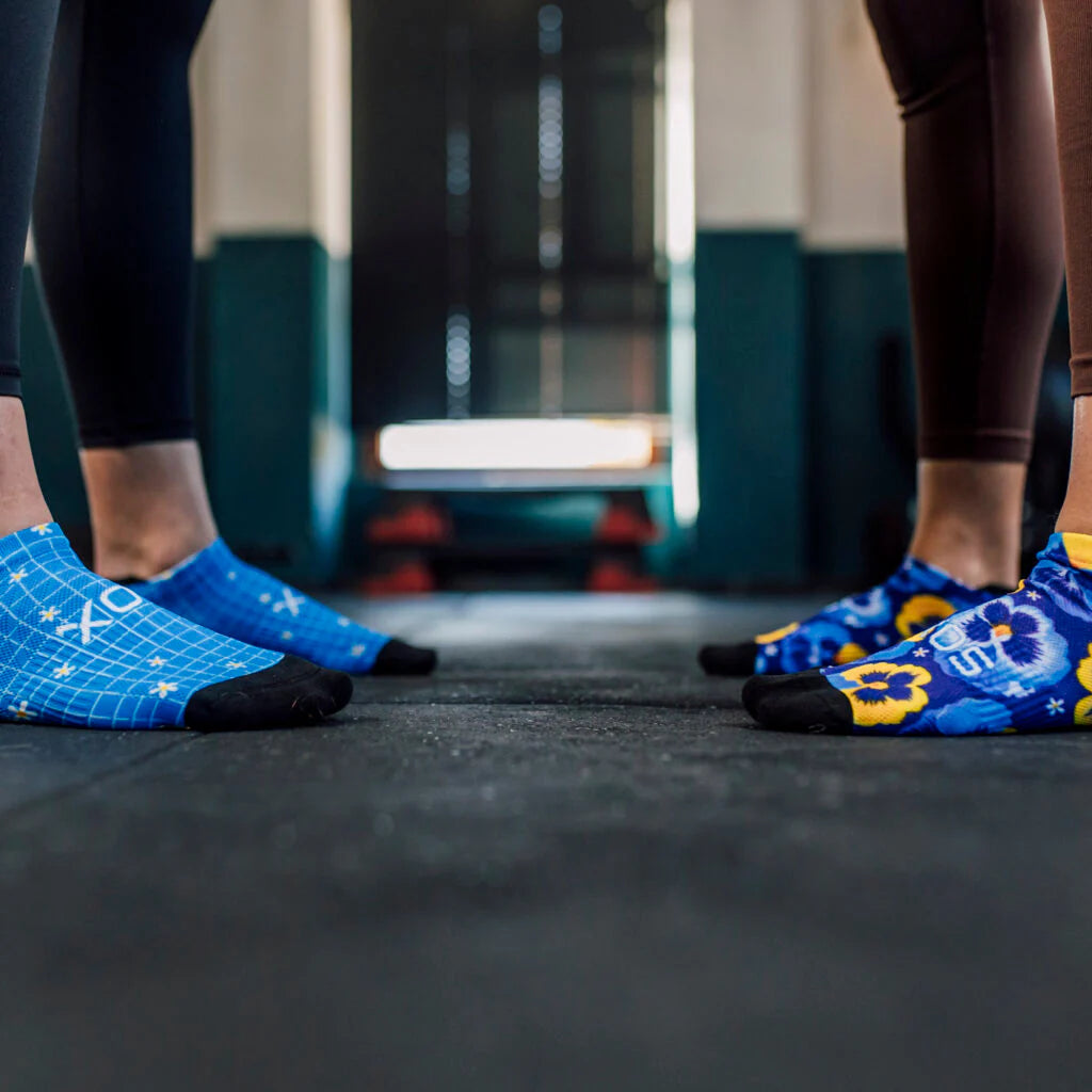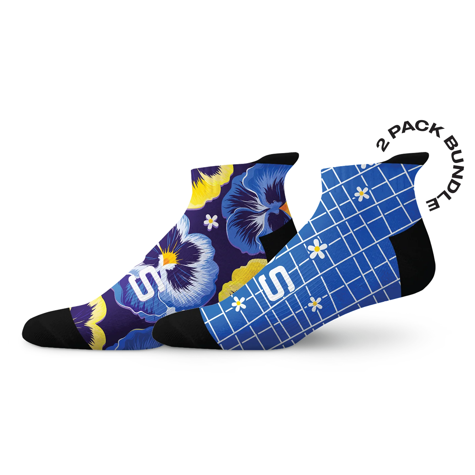 The Pansy Tab Socks Combo offers a beautiful blend of artistic flair and subtle charm. This combo features a vivid pansy floral design on one pair and a simple blue grid with delicate white daisies on the other. It's a perfect mix of bold and balanced style.